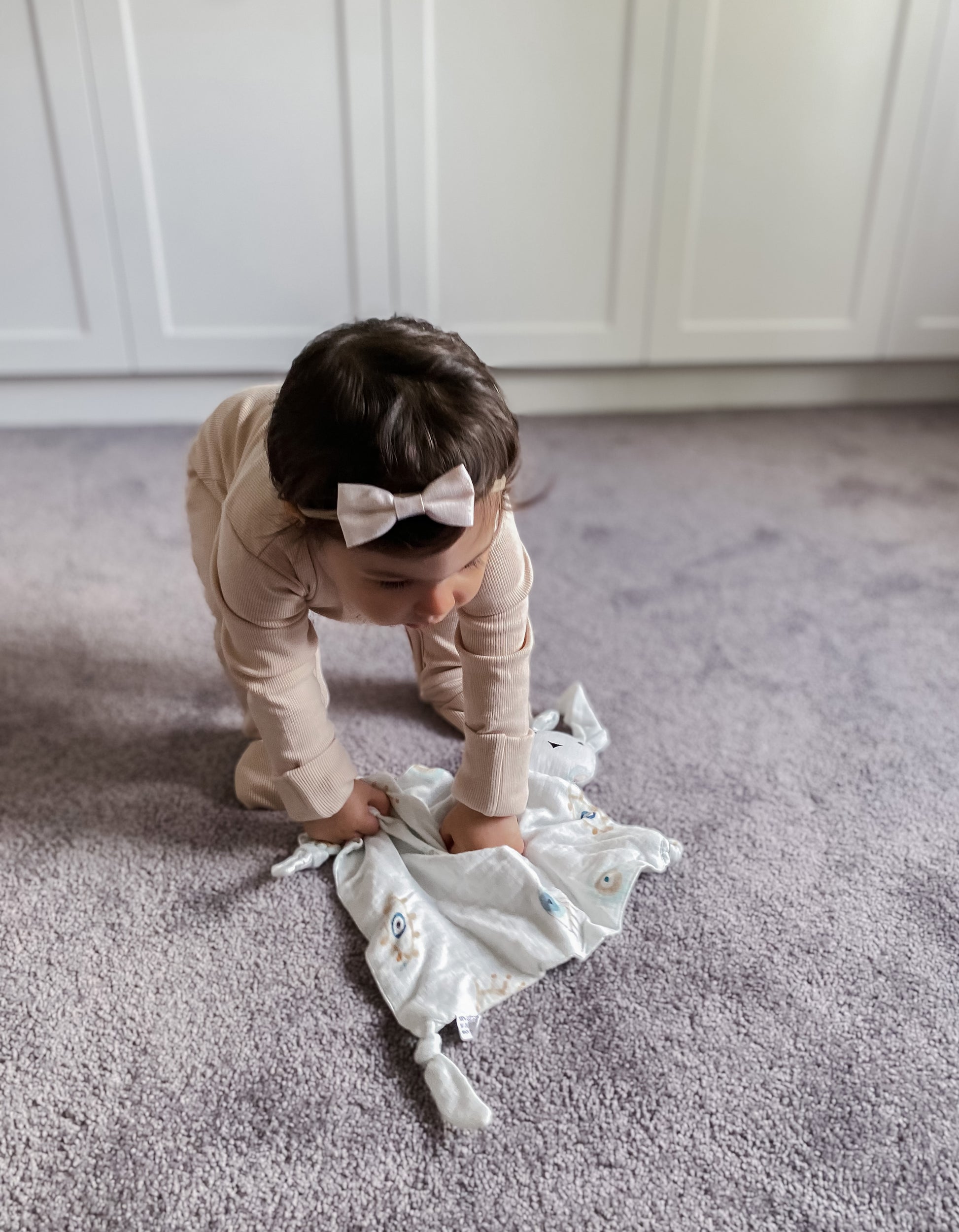 A comforter or lovey can help build positive sleep associations and help your baby feel safe and secure. A comforter is used not only as a sleep aid but throughout the day when your baby might need some added comfort and security. My girls have grown a great attachment to their bunny and lamb comforters from when we introduced them at around 4 months old.